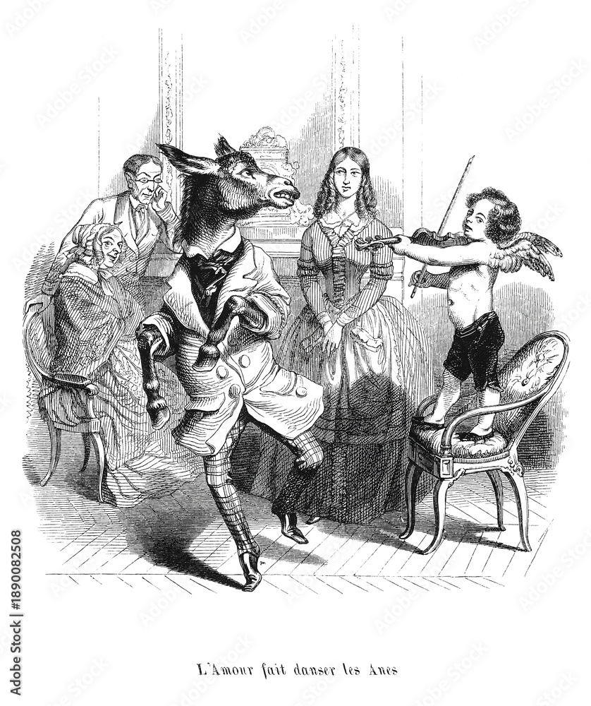 Fotografie An anthropomorphic donkey dancing while young Cupid plays violin for amused Vict