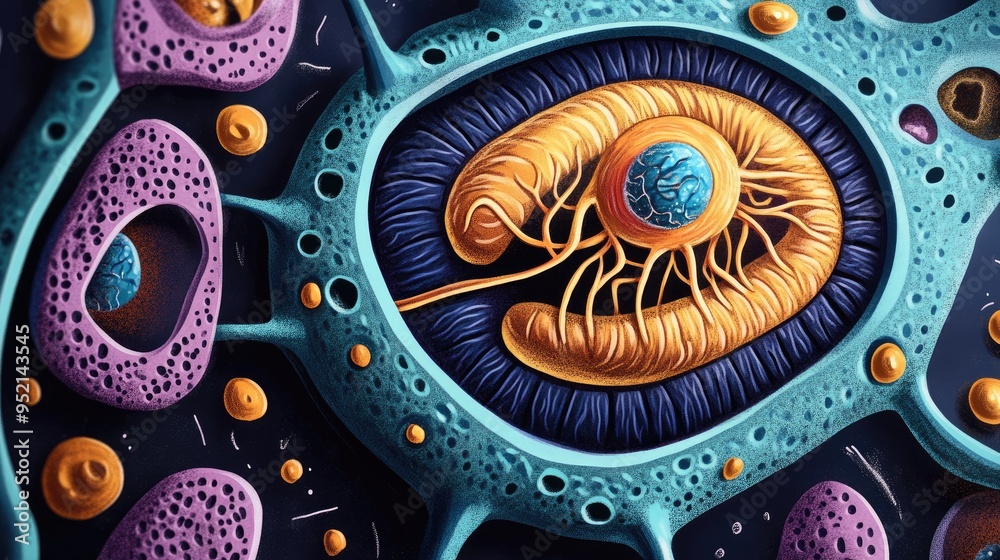 Fotografie Animal cell illustration with labeled components, focusing on the cellular membrane, nucleus, and other critical organelles