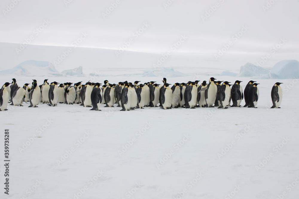 Obraz na plátně Antarctic group of emperor penguins close-up on a cloudy winter day