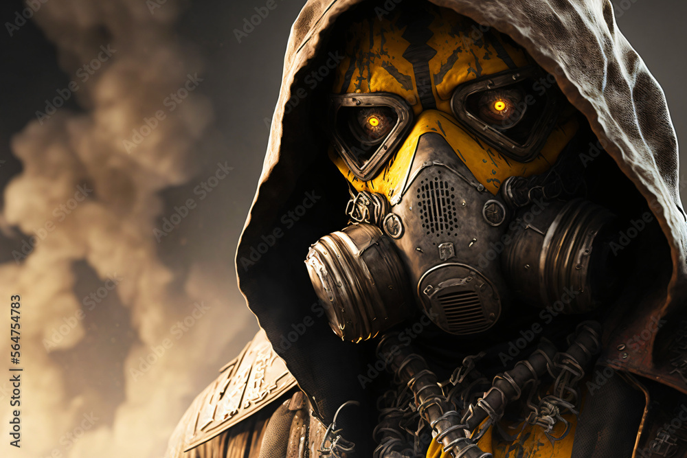 Fotografie apocalyptic character with gas mask, futuristic soldier with burning background,