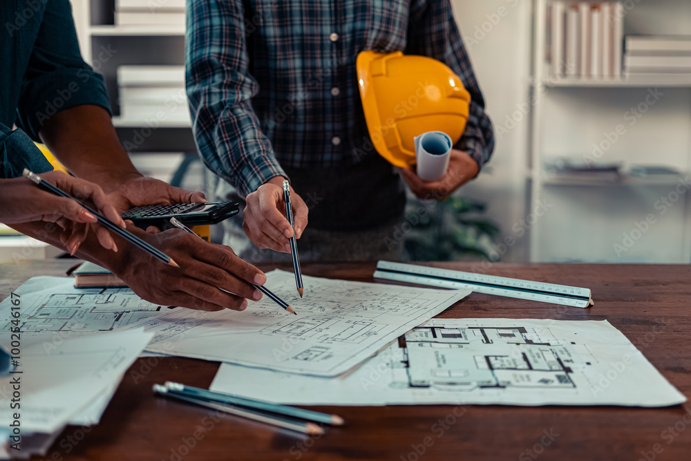 Fotografie Architects and engineers point to blueprints of architectural drawings inside a building to discuss construction plans, with hard hats and architectural documents scattered around