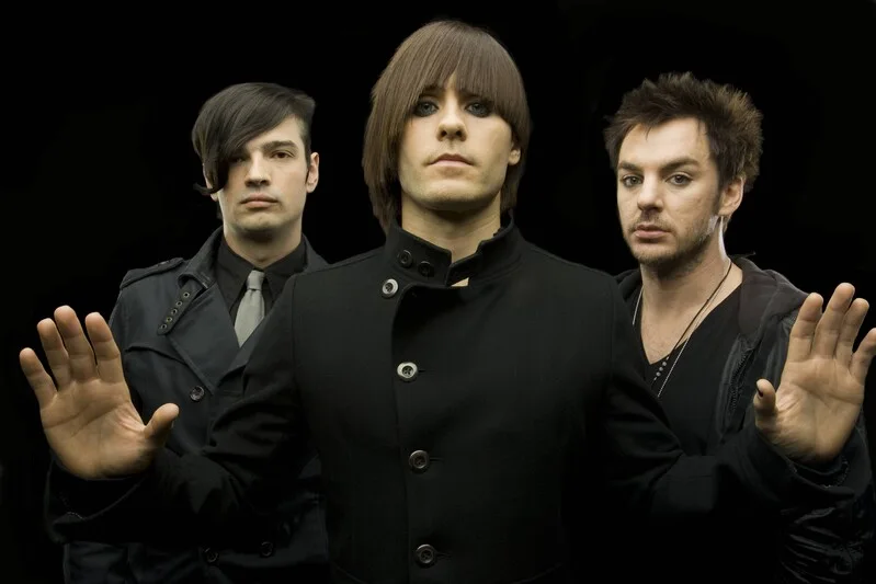Posed studio group portrait of American rock band 30 Seconds to Mars. Left to right are Tomo Milicevic, Jared Leto and Shannon Leto. London, England on February 5 2008. (Photo by Nigel Crane/Redferns)