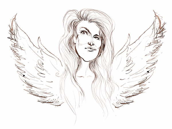 Angela Carter, English novelist and journalist; caricatured with wings in reference to her novel 'Nights at the Circus'