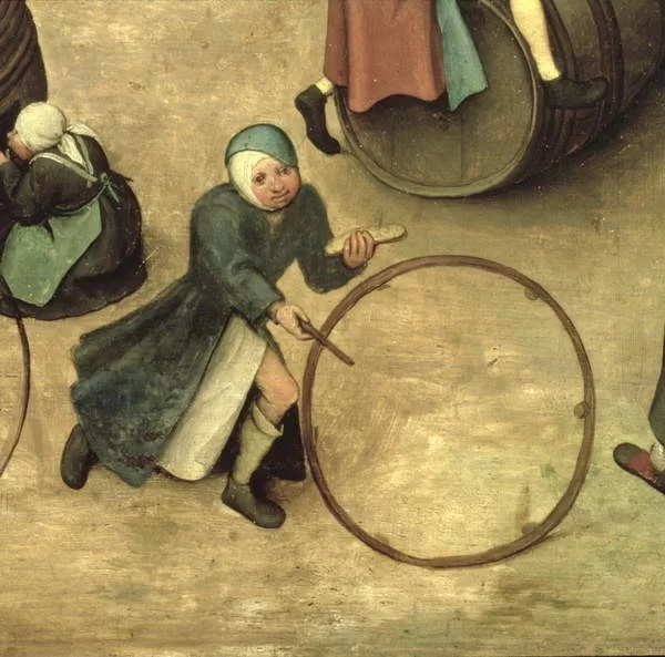 Children's Games (Kinderspiele): detail of a child with a stick and hoop, 1560