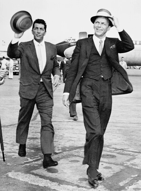 Dean Martin (l) and Frank Sinatra (r) make their way across the London Airport tarmac before travelling to Shepperton Studios to film a two-minute cameo in Bing Crosby and Bob Hope's comedy 'Road To Hong Kong'. (Photo by PA Images via Getty Images)
