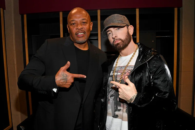 CLEVELAND, OHIO - OCTOBER 30: Dr. Dre and Eminem pose backstage during the 36th Annual Rock & Roll Hall Of Fame Induction Ceremony at Rocket Mortgage Fieldhouse on October 30, 2021 in Cleveland, Ohio. (Photo by Kevin Mazur/Getty Images for The Rock and Roll Hall of Fame )