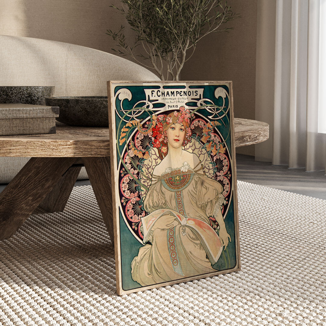 Muchan maalauksessa unelmoiva nuori nainen selailee koristeellisia malleja sisältävää kirjaa, ehkä painatuskäyttöön tarkoitettuja näytteitä. Hänen takanaan oleva ympyrä on koristeltu runsaasti kukilla, joiden varret muodostavat pitsikuvion.