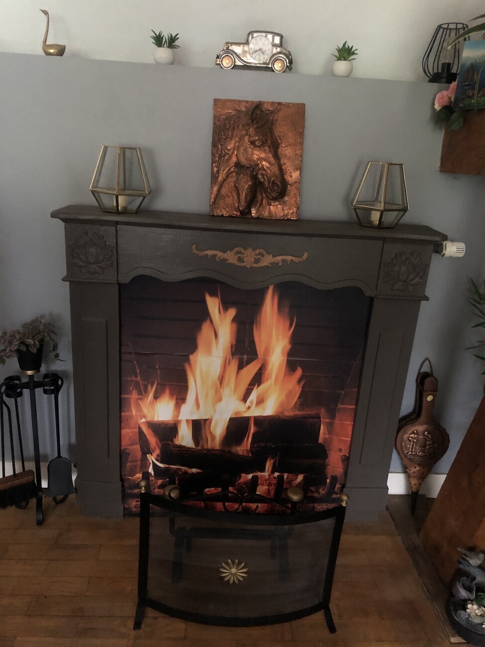 Fireplace burning wood logs, cozy warm home christmas time