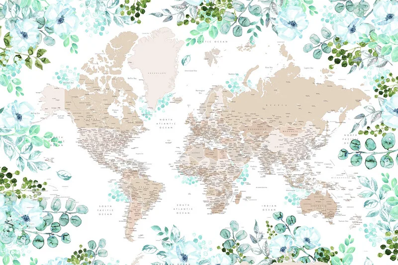 Obraz na plátně Floral bohemian world map with cities, Leanne