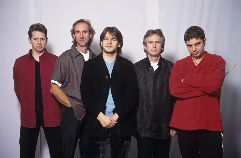 UNSPECIFIED - JANUARY 01: Posed group portrait of Genesis. Left to right are Anto Drennan, Mike Rutherford, Ray Wilson, Tony Banks and Nir Zidkyahu in 1998. (Photo by Mick Hutson/Redferns)