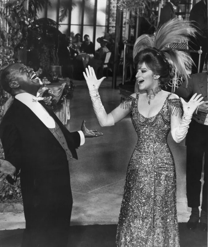 American jazz musician and actor Louis Armstrong (1900 - 1971) and American singer and actor Barbra Streisand singing together in a still from director Gene Kelly's film 'Hello, Dolly!.' Armstrong is wearing white tie and tails, and Streisand is wearing a sequined gown and a feathered headdress. (Photo by Hulton Archive/Getty Images)