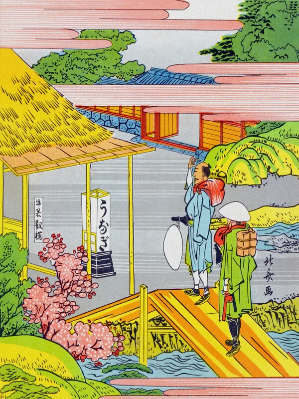 Samolepka Ishiyakushi-juku / Japanese Samurai on the Bridge (Pink & Green Japandi) - Katsushika Hokusai