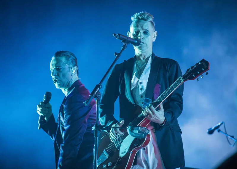 Martin Gore and Dave Gahan from Depeche Mode performing on stage during the Isle of Wight festival at Seaclose Park, Newport. (Photo by David Jensen/PA Images via Getty Images)