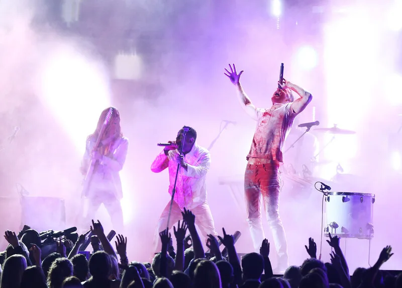 LOS ANGELES, CA - JANUARY 26: Kendrick Lamar and singer Dan Reynolds of Imagine Dragons perform onstage during the 56th GRAMMY Awards held at Staples Center on January 26, 2014 in Los Angeles, California. (Photo by Michael Tran/FilmMagic)