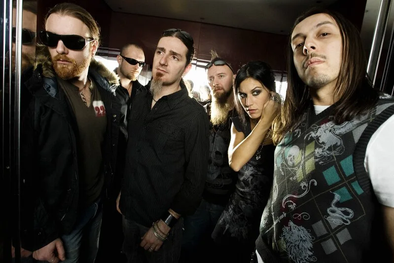 LEEDS, ENGLAND - NOVEMBER 08: Lacuna Coil posed in Leeds on November 08 2008. L - R Marco Biazzi, Marco Coti Zelati, Cristiano Migliore, Cristiano Mozzati, Cristina Scabbia, Andrea Ferro (Photo by Nigel Crane/Redferns)