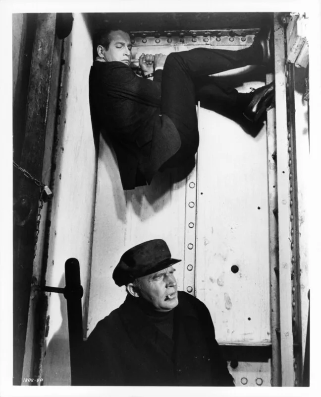 Paul Newman crouching above man in a scene from the film 'The Prize', 1963. (Photo by Metro-Goldwyn-Mayer/Getty Images)