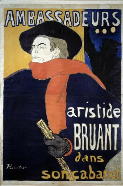 Poster for the spectable by Aristide Bruant (1851-1925), french songwriter. “” Ambassadors - Aristide Sparrow in his cabaret “”. Lithograph by Henri de Toulouse-Lautrec . 1892. Dim 1,41 x 0,98 m Brussels, musee d'Ixelles