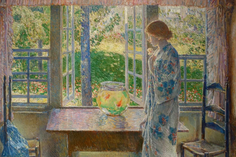 Plakát The Goldfish Window (Traditional Vintage Female Portrait of a Ginger Girl & A Gold fish Bowl) - Frederick Childe Hassam