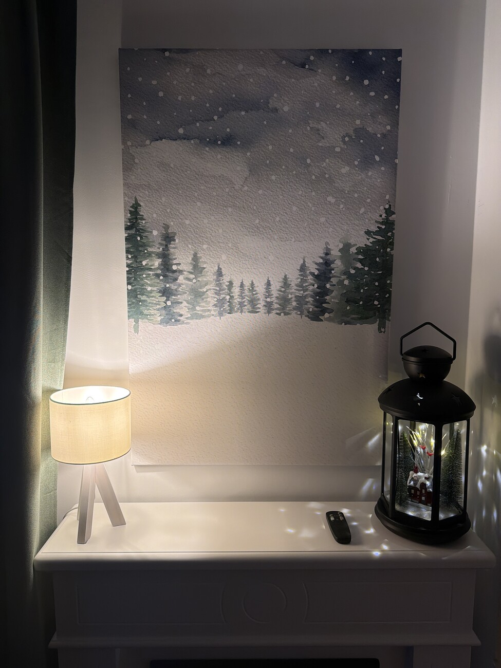 Watercolor landscape painting with snow and pine trees