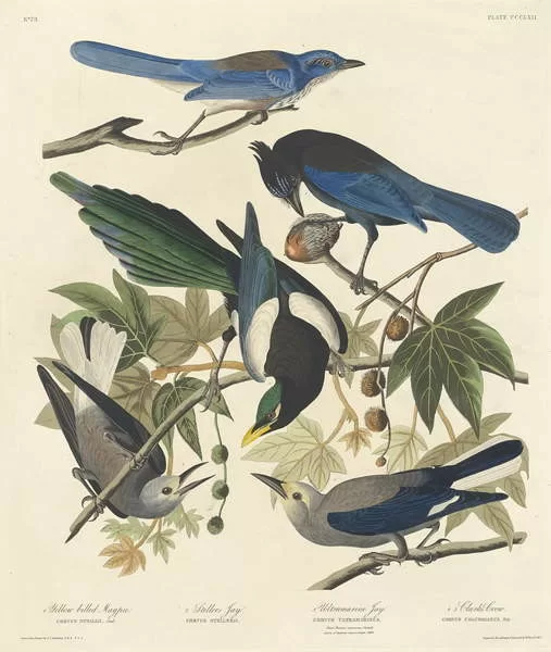 Yellow-billed Magpie, Stellers Jay, Ultramarine Jay and Clark's Crow, 1837
