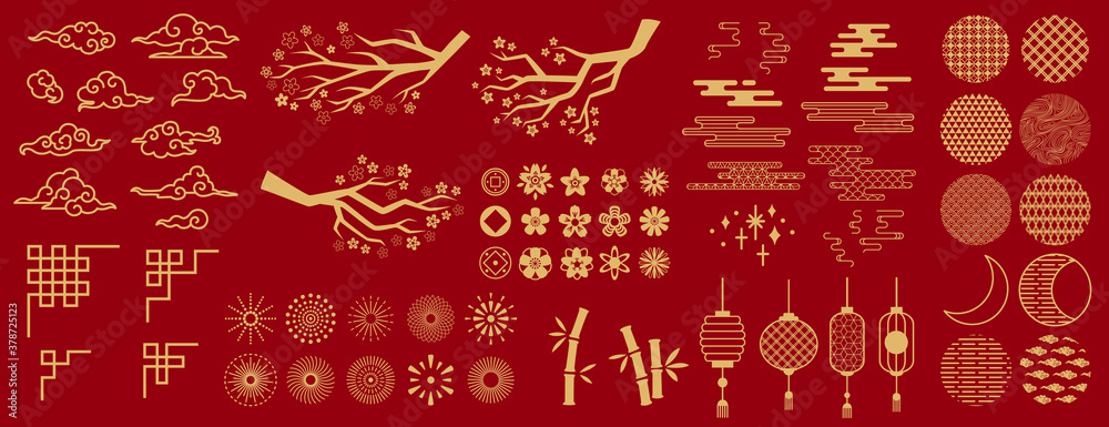 Asia elements. Chinese festive decor gold floral patterns and ornament, lanterns, clouds and moon, flowers sakura branch oriental vector set. Japanese decoration symbols as bamboo and branches