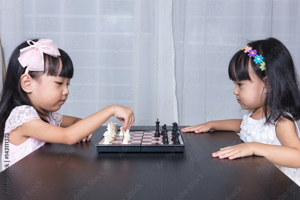 Fotografie Asian Chinese little sisters playing chess together at home