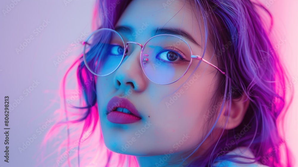 Fotografie Asian woman with purple hair and glasses is looking at the camera