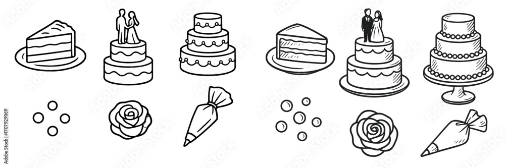 Fotografie Assortment of wedding cakes, tiered desserts, cake slices, baking tools, and ele