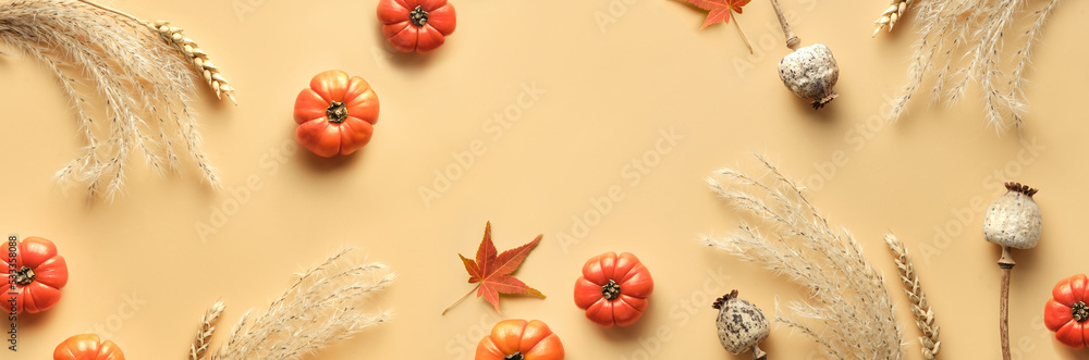 Fotografie Autumntime panoramic banner background with tiny orange pumpkins, dry pampas grass and wheat ears