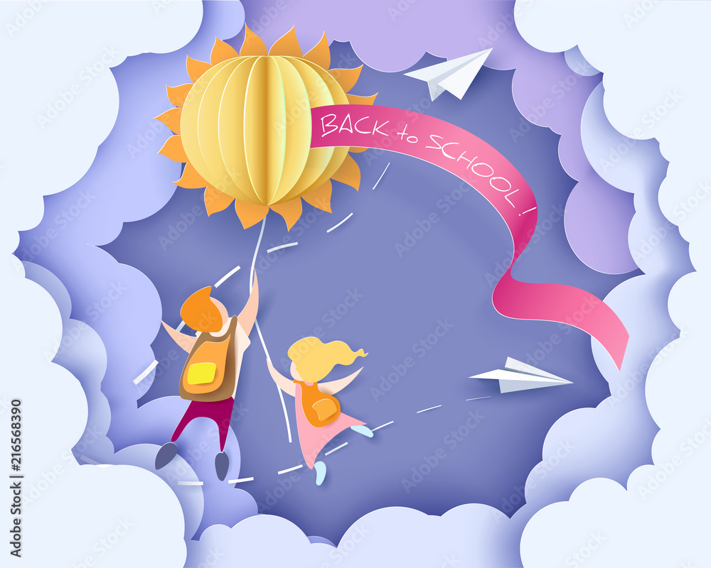 Fotografie Back to school 1 september card with kids and sun on blue sky background