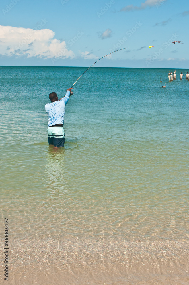 Fotografie Back view, far distance of a African American, male, casting a fishing rod, whil