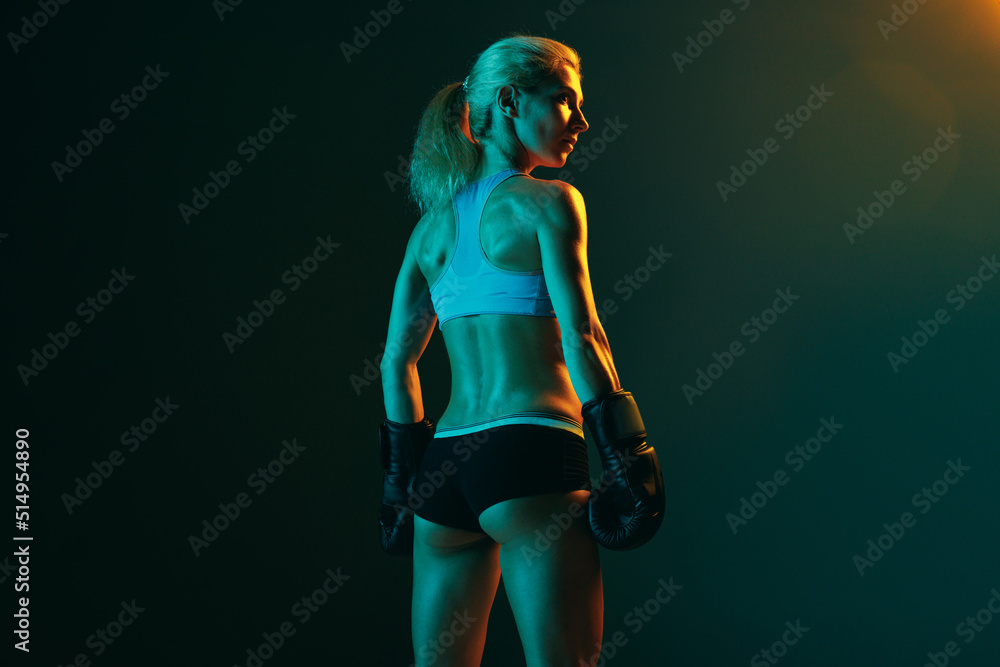 Obraz na plátně Back view of young woman, female professional kickboxer in sports uniform and gloves training isolated on dark green background in neon