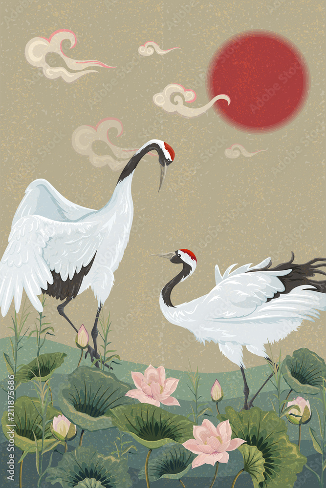 Fotografie background with japanese cranes and lotuses