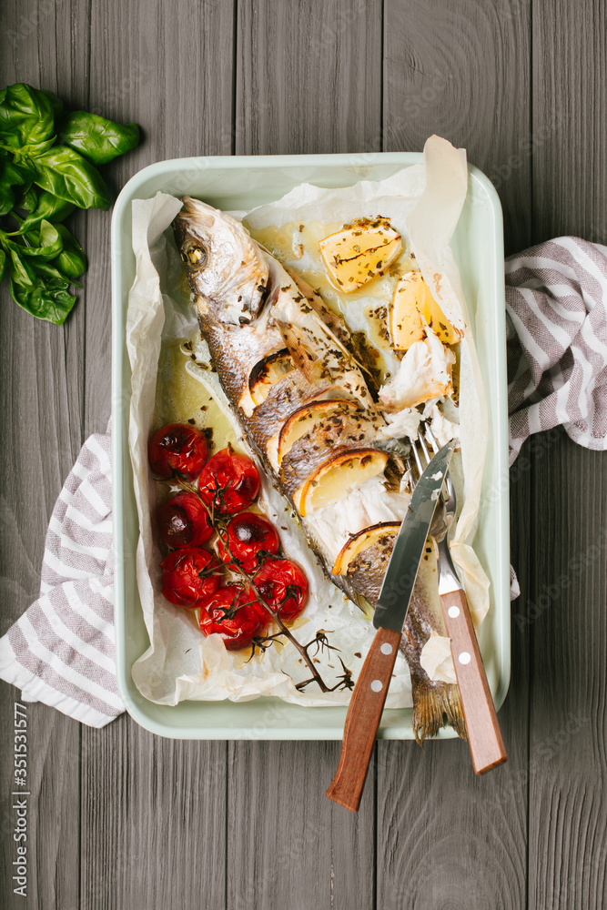 Fotografie Baked sea bass with cherry tomatoes, selective focus