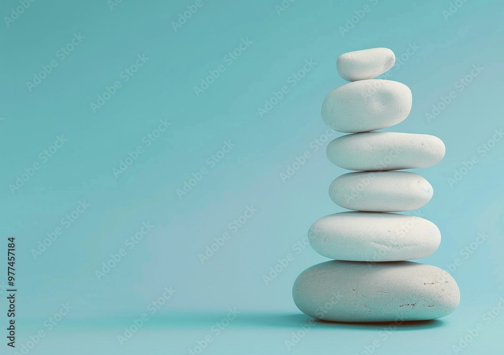 Fotografie Balanced stones stacked on top of each other against a soft blue background