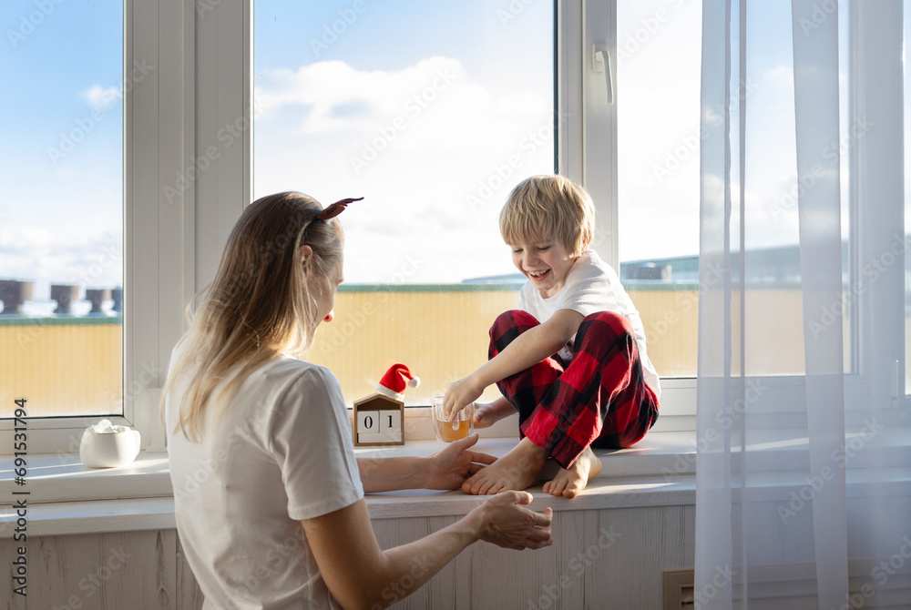 Fotografie barefoot boy sits on the windowsill, with his mother tickling his feet