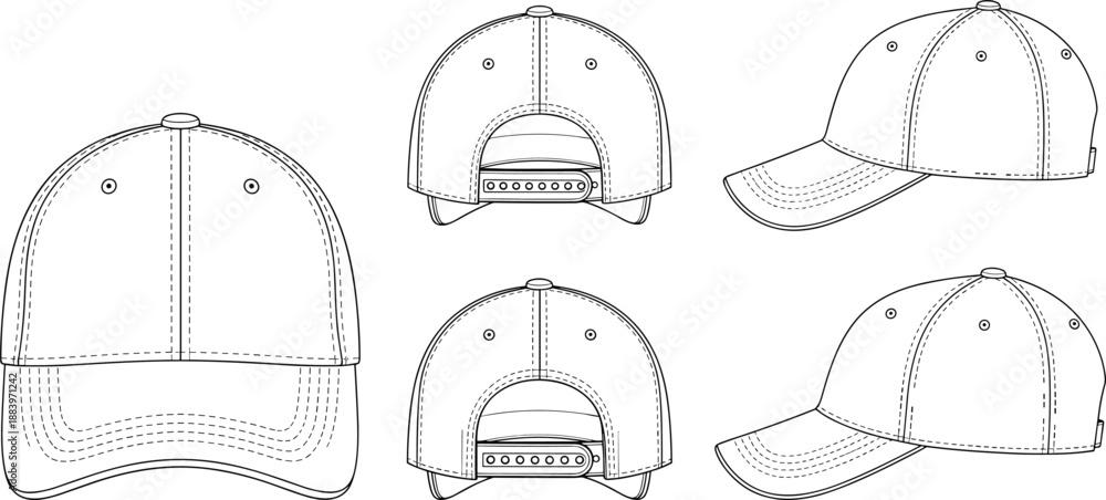 Fotografie Baseball cap vector technical illustration set showing front back and side views