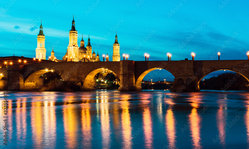 Obraz na plátně Basilica del Pilar and Puente de Piedra reflected in the Ebro river during the b