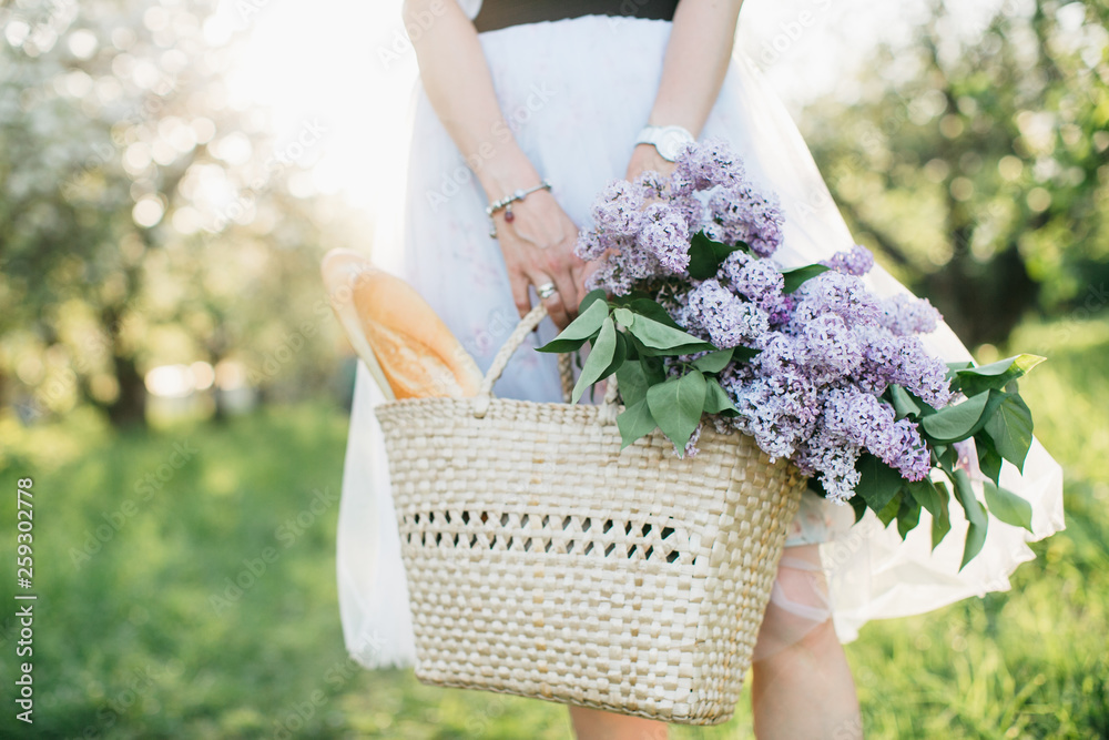 Obraz na plátně Basket with bouquet of lilacs and baguette in woman hands on background of natur