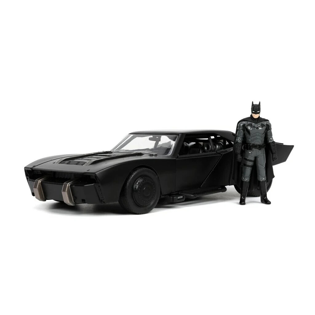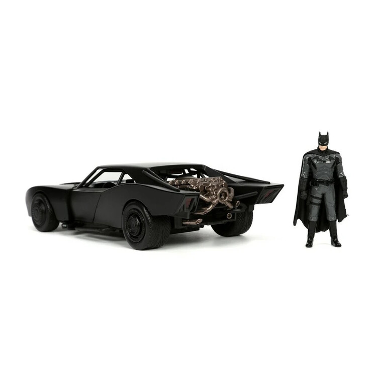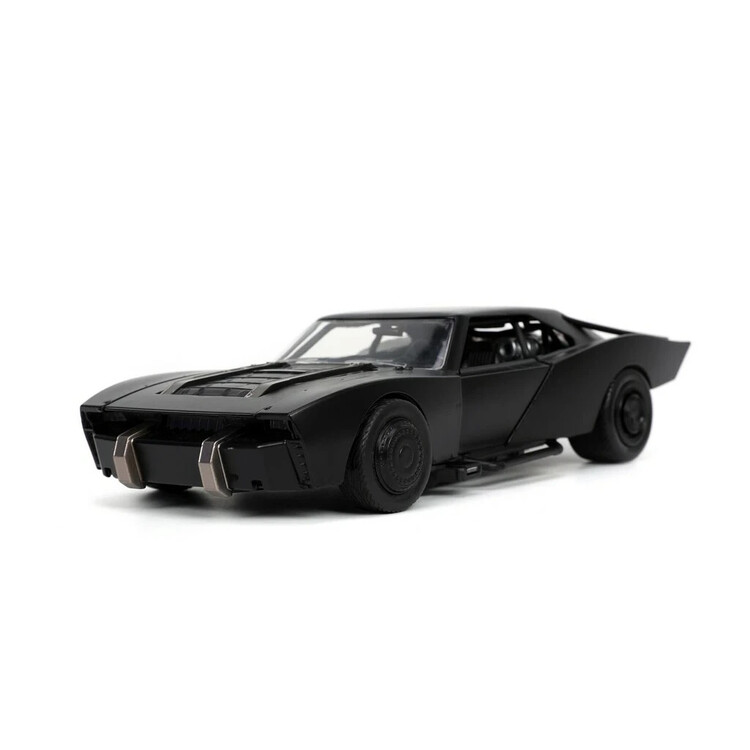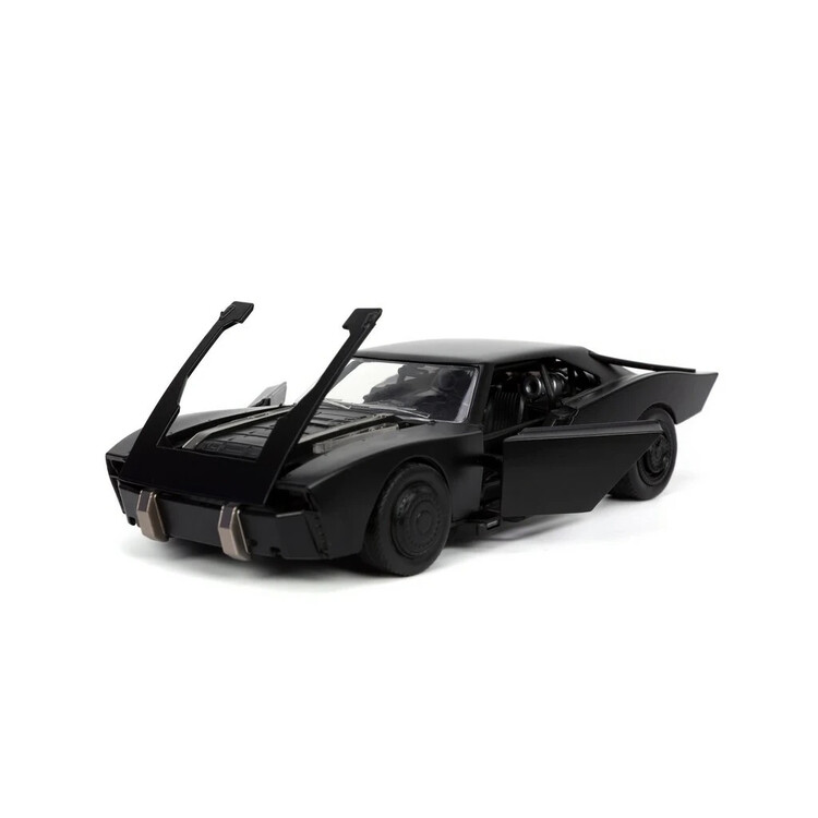 Kovový die-cast Batmobile 1:24 od Jada (Hollywood Rides) inspirovaný filmem „The Batman“; otevírací dveře, gumové pneumatiky a volnoběh, součástí kovová figurka Batmana ~7 cm; oficiální licence, od 8 let.