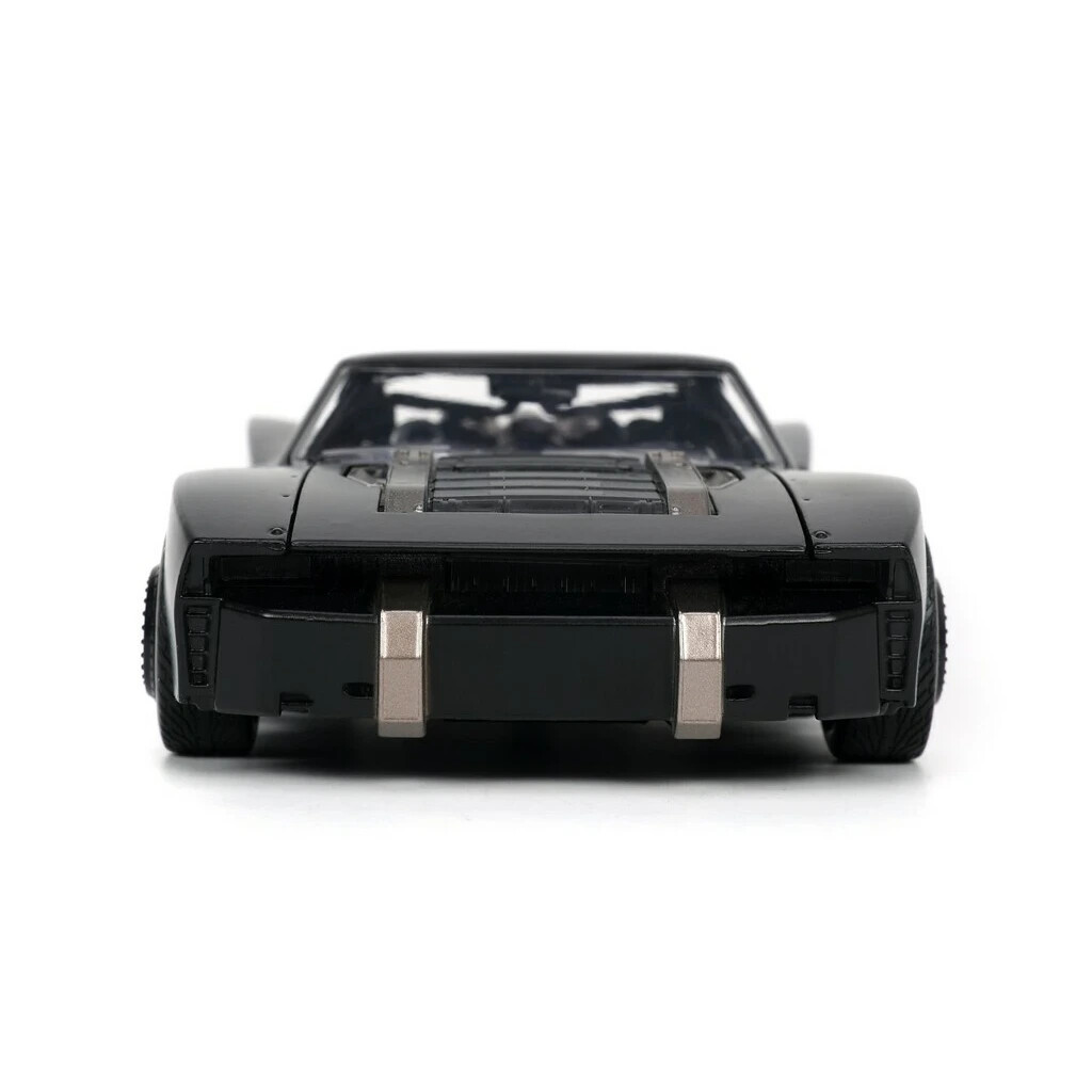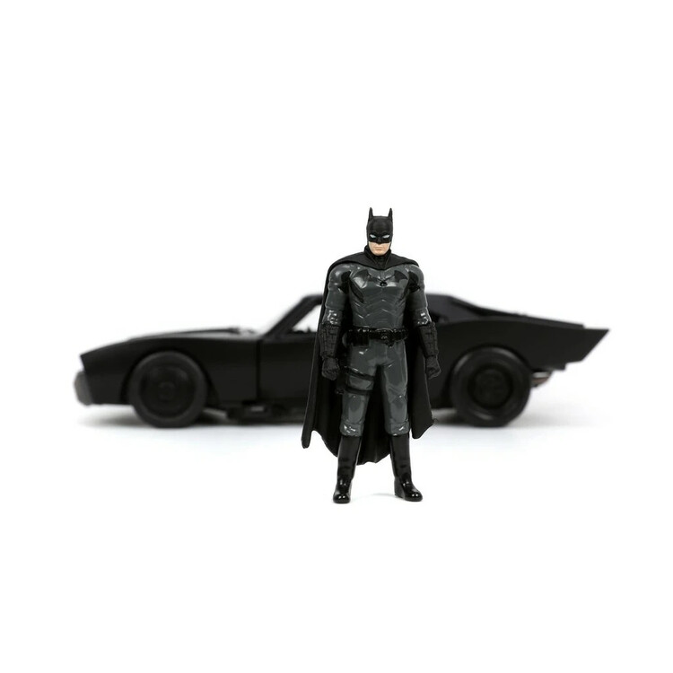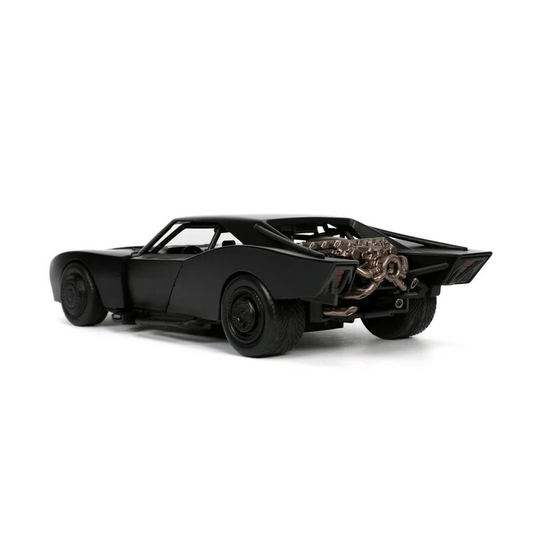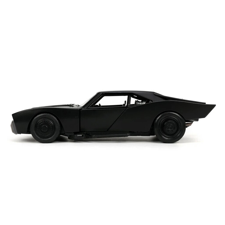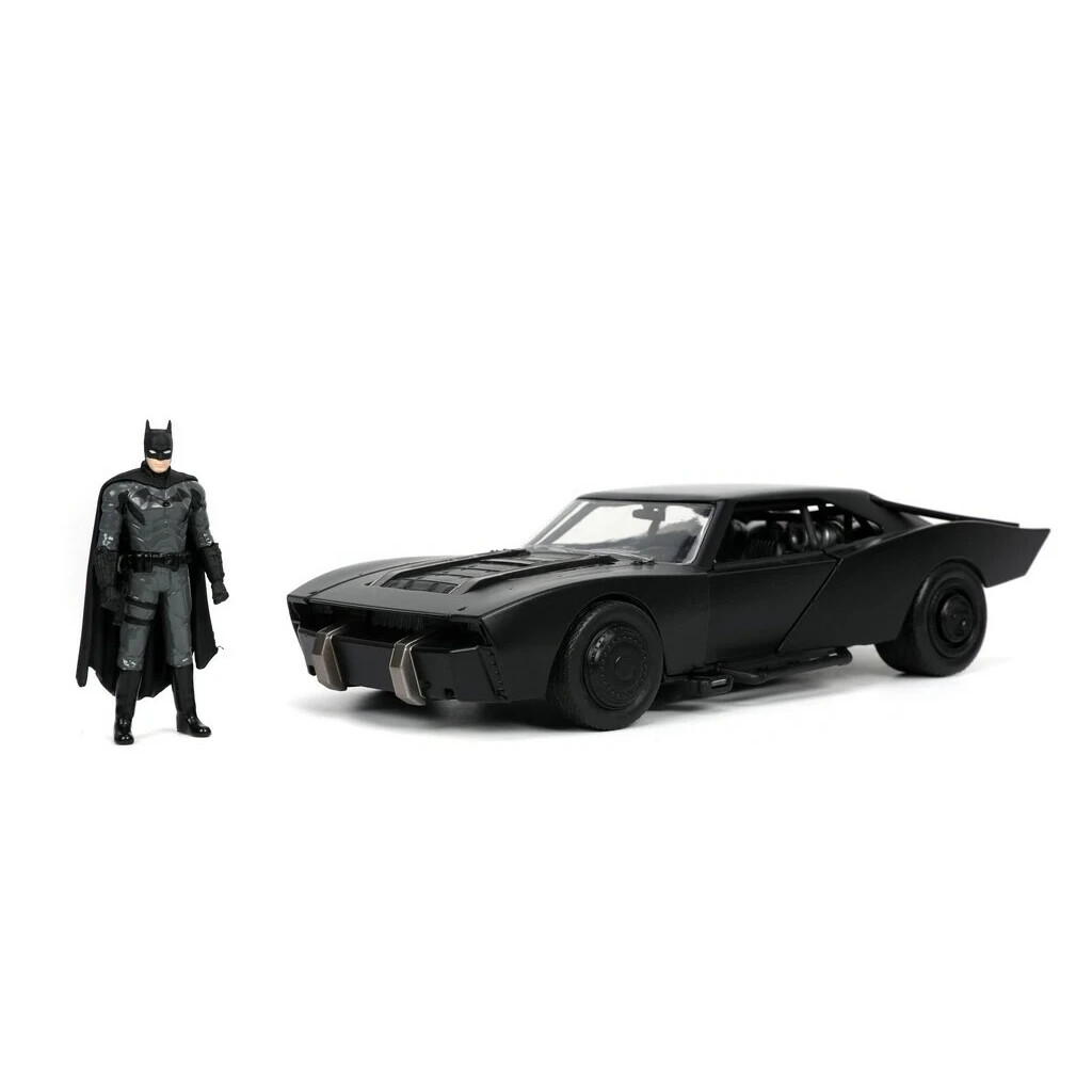 Kovový die-cast Batmobile 1:24 od Jada (Hollywood Rides) inspirovaný filmem „The Batman“; otevírací dveře, gumové pneumatiky a volnoběh, součástí kovová figurka Batmana ~7 cm; oficiální licence, od 8 let.
