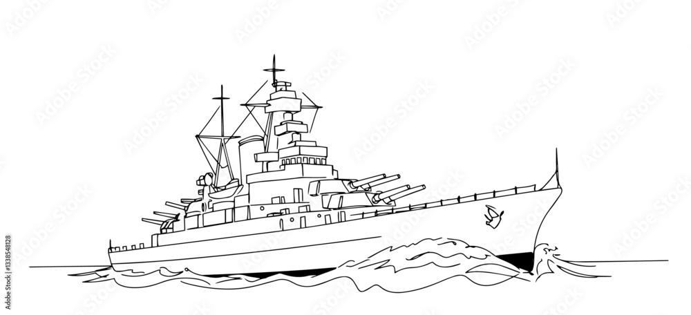 Fotografie battleship sailing through rough waters, its cannons ready line art one line vec