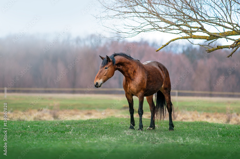 Fotografie Beautiful bay horse with a long neck stands impressively on a green meadow