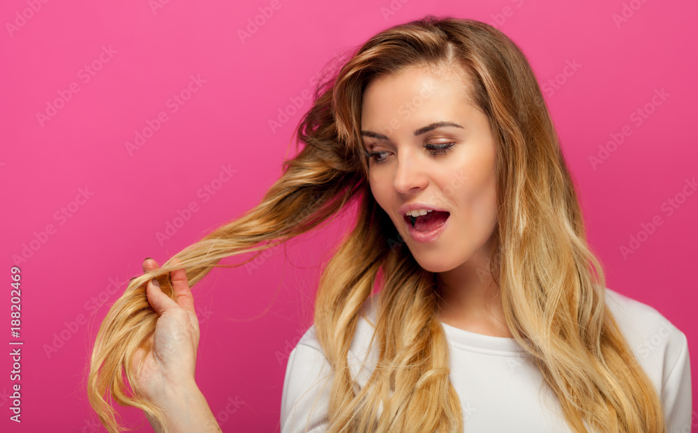 Fotografie Beautiful blonde on pink background girl looking at her long hair