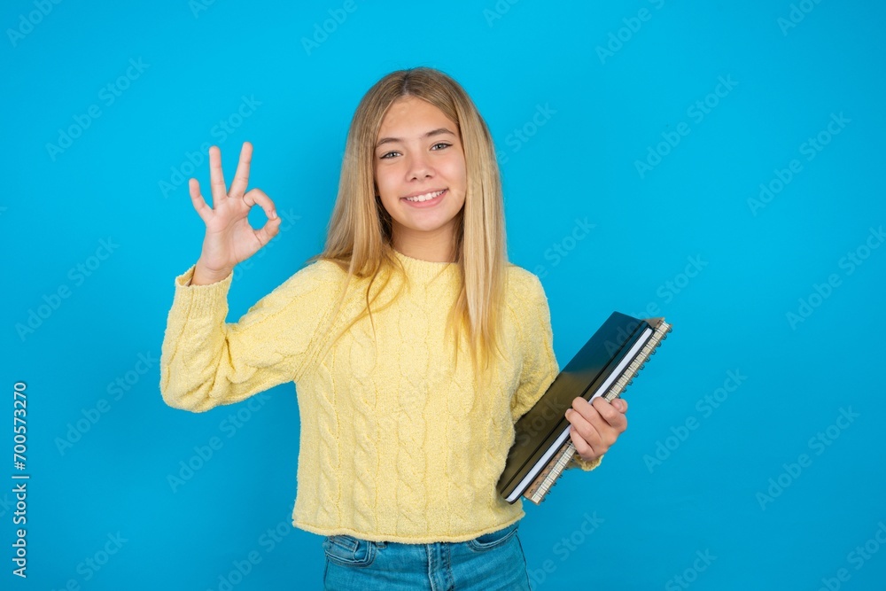 Fotografie beautiful caucasian teen girl wearing yellow sweater hold hand arm okey symbol t