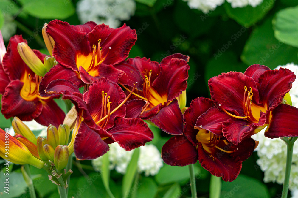 Obraz na plátně Beautiful dark burgundy daylily flower in the garden on a flower bed