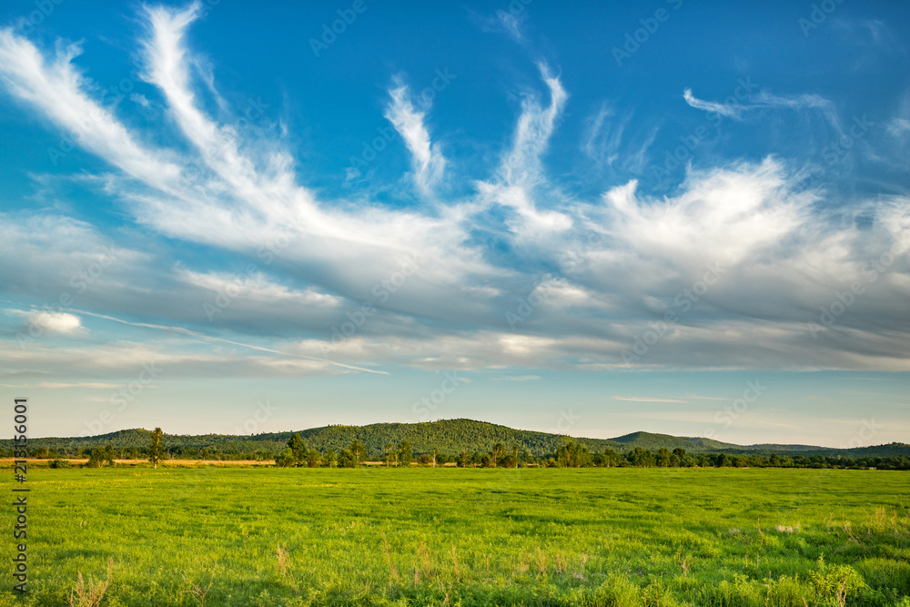 Fotografie Beautiful green field and blue sky with clouds on a bright sunny day