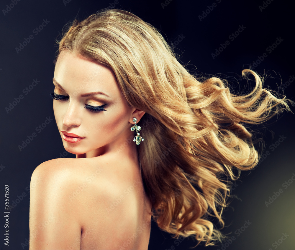 Fotografie Beautiful model blond with curly hair and fashion earings