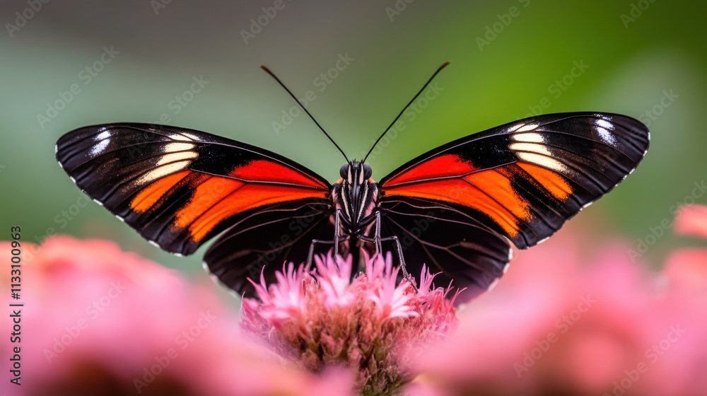 Fotografie Beautiful orange and black butterfly with its wings spread wide, perched on a pi