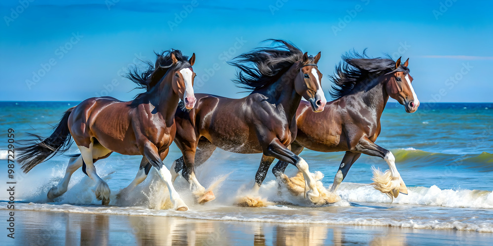 Obraz na plátně Beautiful Shire horses galloping on beach with blue sea in background, Shire, ho